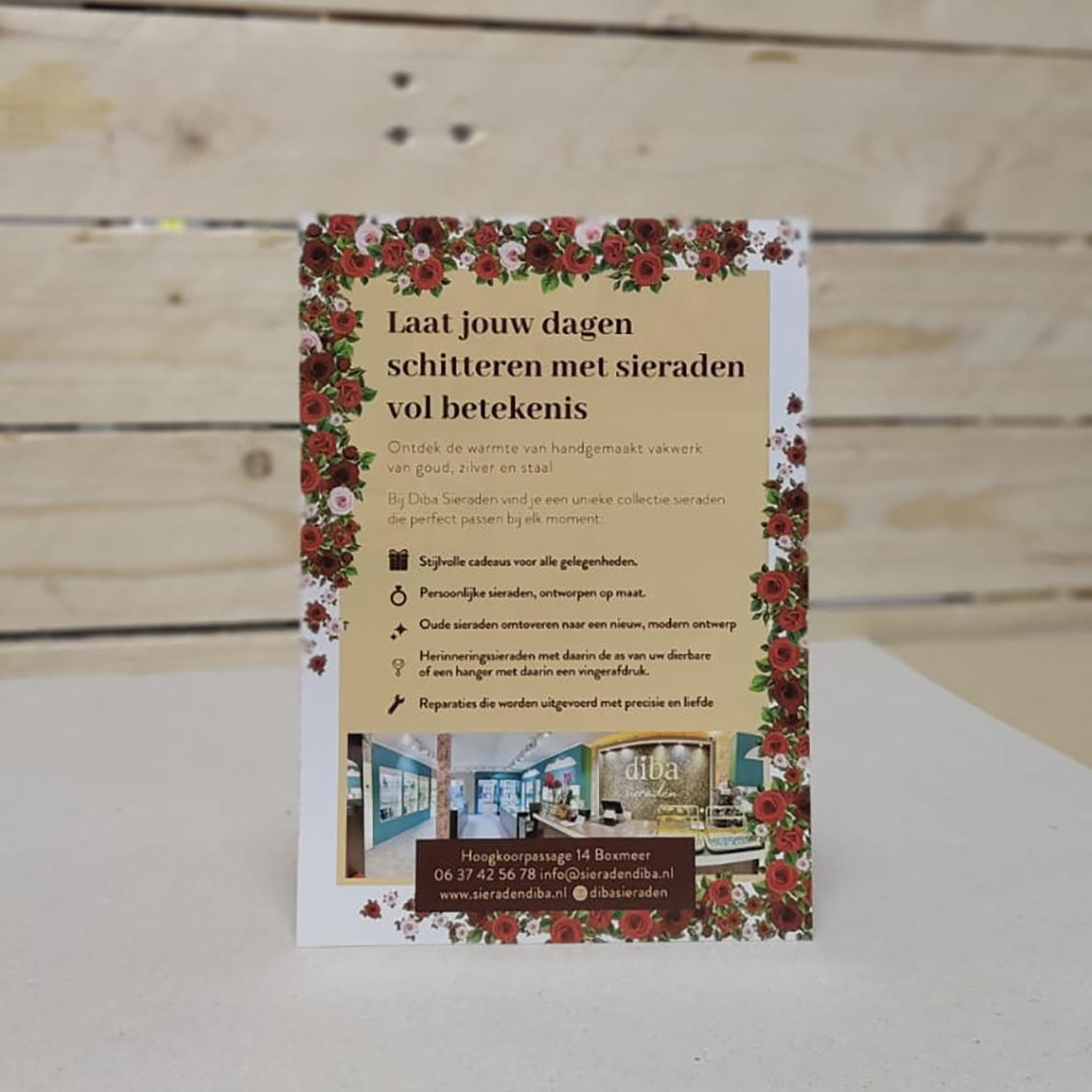 Flyers voor jouw bedrijf met jouw producten en diensten? Kies voor flyers van MAAY drukwerk! Gedrukt in full colour en beschikbaar in verschillende formaten. Hier heb je keuze uit een aantal voordelige populaire papiersoorten waarmee je niet fout kan gaan. Dit hebben we bewust gedaan om de prijs laag te houden maar vooral zodat jij geen ingewikkelde keuzes hoeft te maken. Liever een andere papiersoort, formaat, oplage? Neem contact met ons op en we begeleiden je hierin en vertellen je graag over de mogelijkheden.
